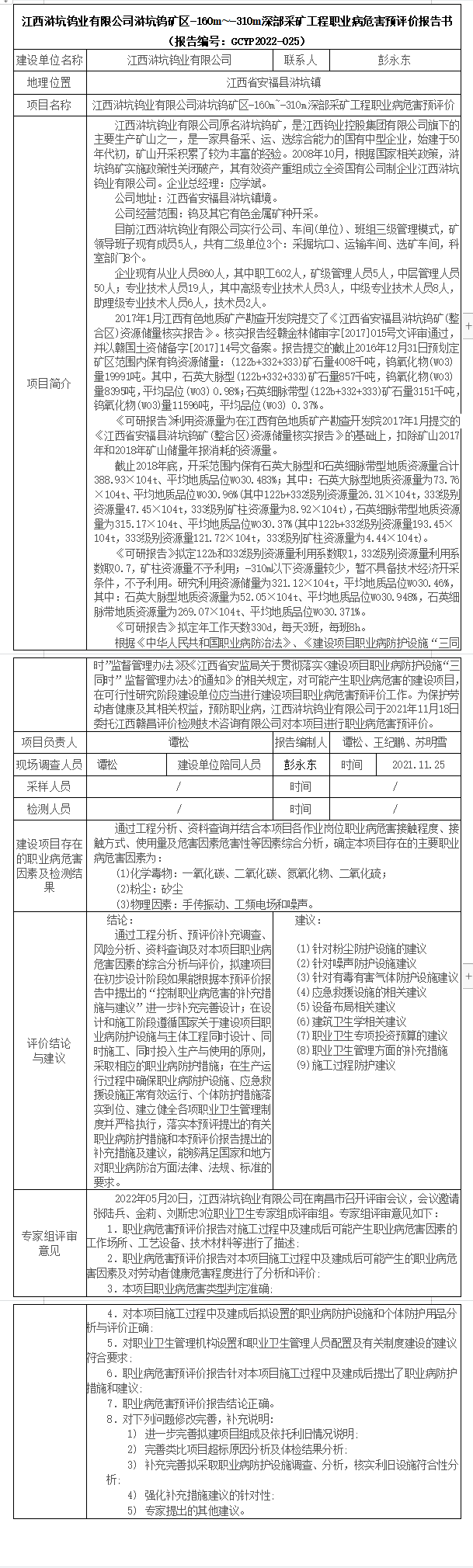 江西滸坑鎢業(yè)有限公司滸坑鎢礦區(qū)-160m~-310m深部采礦工程職業(yè)病危害預評價報告書