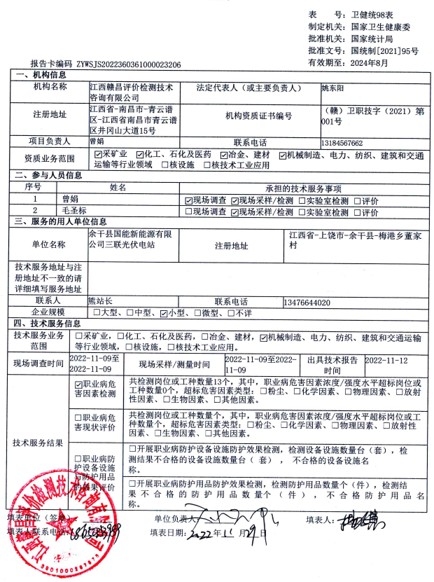 余干縣國能新能源有限公司三聯(lián)光伏電站工作場所職業(yè)病危害因素檢測報告