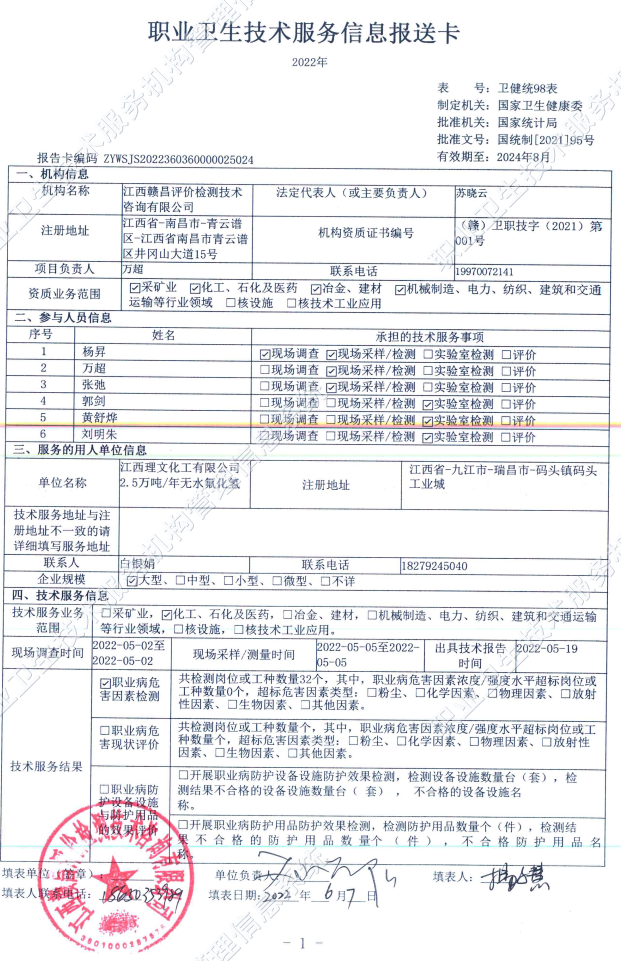 江西理文化工有限公司2.5萬(wàn)噸/年無(wú)水氟化氫工作場(chǎng)所職業(yè)病危害因素檢測(cè)報(bào)告