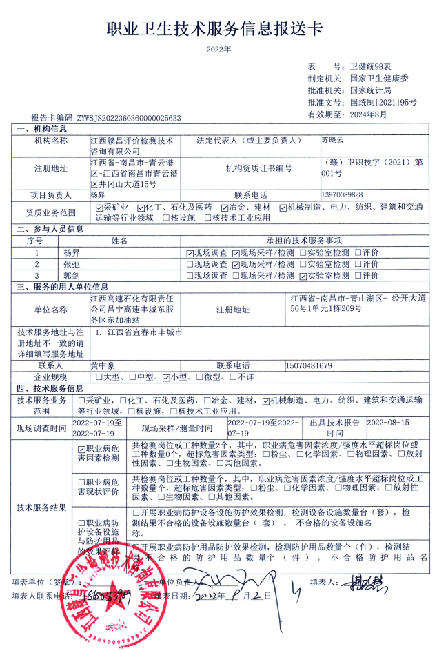 江西高速石化有限責(zé)任公司昌寧高速豐城東服務(wù)區(qū)東加油站工作場所職業(yè)病危害因素檢測報告