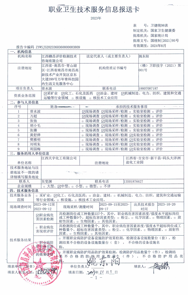 江西天宇化工有限公司工作場所職業(yè)病危害因素檢測報告