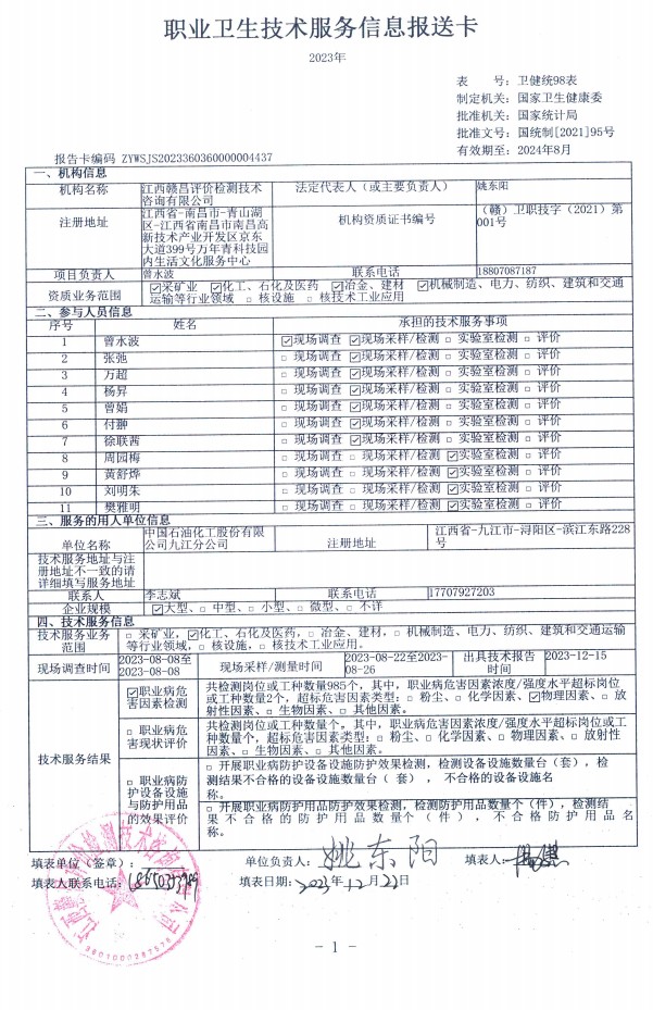 中國石油化工股份有限公司九江分公司工作場所職業(yè)病危害因素檢測報告