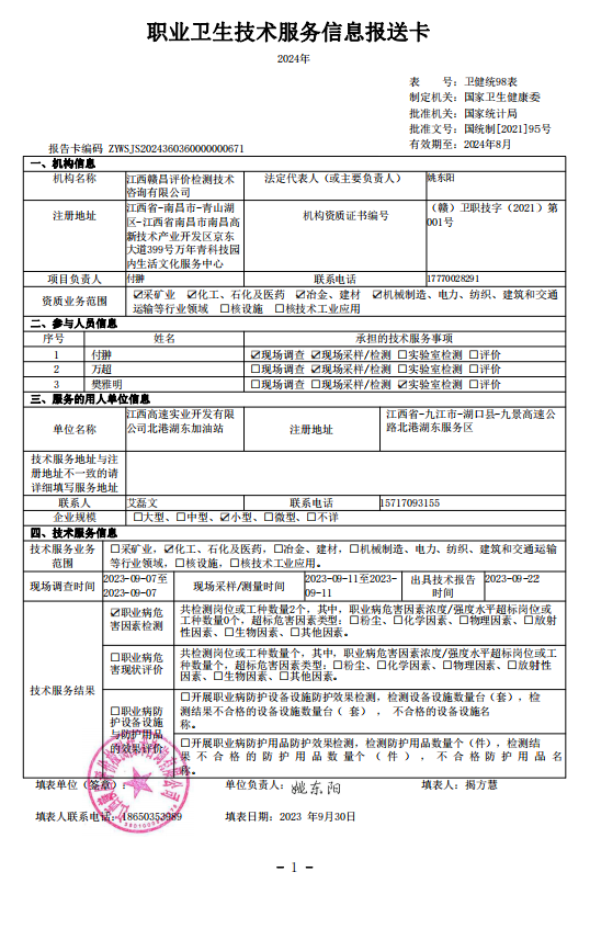 《江西高速實業(yè)開發(fā)有限公司北港湖東加油站工作場所職業(yè)病危害因素檢測報告》(報告編號:GCJC-23-152-11)