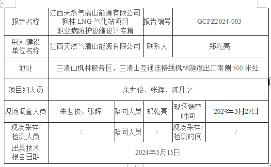 江西天然氣清山能源有限公司 楓林LNG氣化站項(xiàng)目 職業(yè)病防護(hù)設(shè)施設(shè)計(jì)專篇GCFZ2024-003