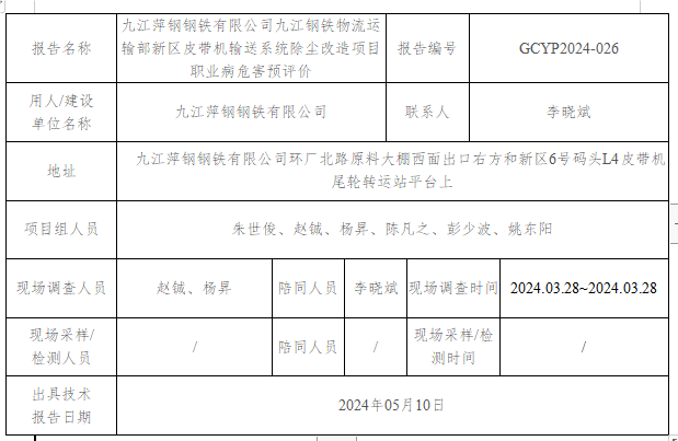 九江萍鋼鋼鐵有限公司九江鋼鐵物流運輸部新區(qū)皮帶機輸送系統(tǒng)除塵改造項目 職業(yè)病危害預評價GCYP2024-026