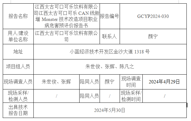 下一篇:江西太古可口可樂飲料有限公司江西太古可口可樂CAN線新增Monster技術(shù)改造項目職業(yè)病防護(hù)設(shè)施設(shè)計專篇GCFZ2024-009