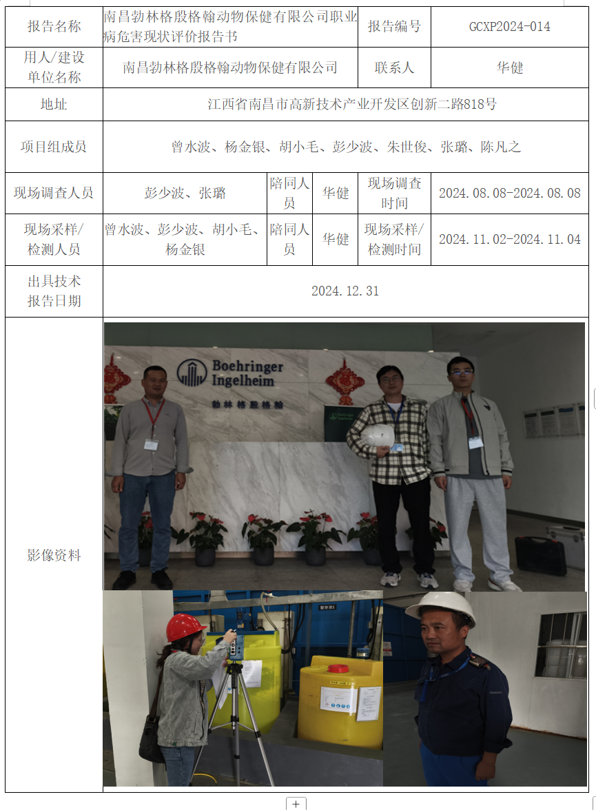 南昌勃林格殷格翰動物保健有限公司職業(yè)病危害現(xiàn)狀評價報告書