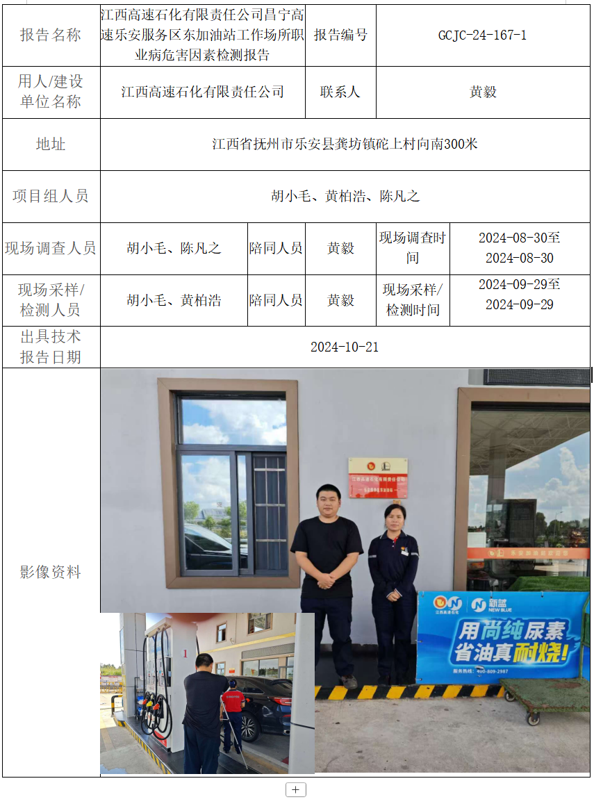 江西高速石化有限責(zé)任公司昌寧高速樂(lè)安服務(wù)區(qū)東加油站工作場(chǎng)所職業(yè)病危害因素檢測(cè)報(bào)告