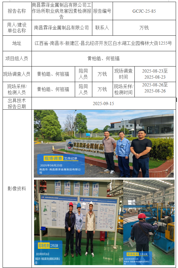 南昌霖澤金屬制品有限公司工作場所職業(yè)病危害因素檢測報告
