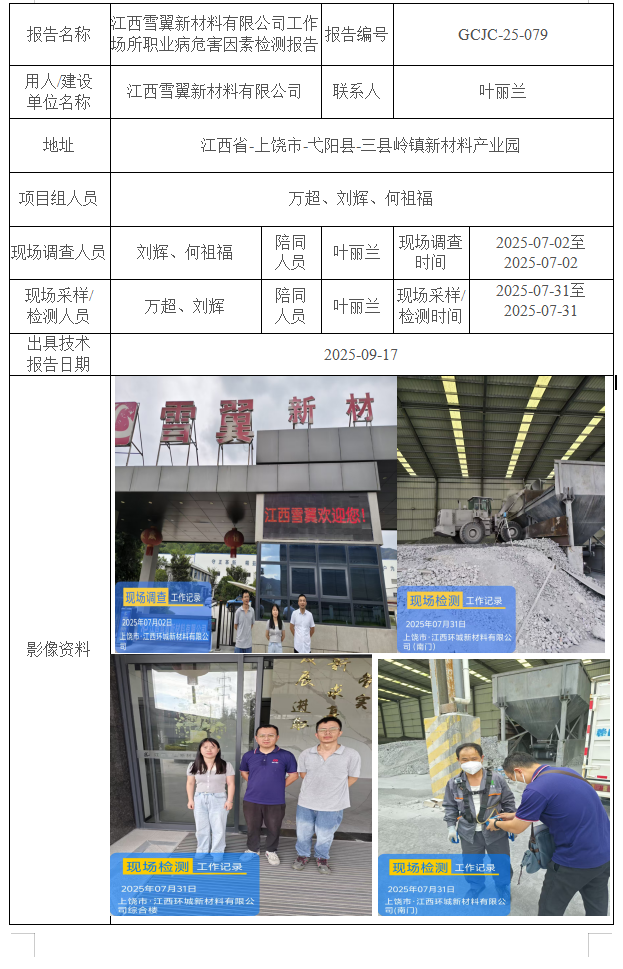 江西雪翼新材料有限公司工作場所職業(yè)病危害因素檢測報告
