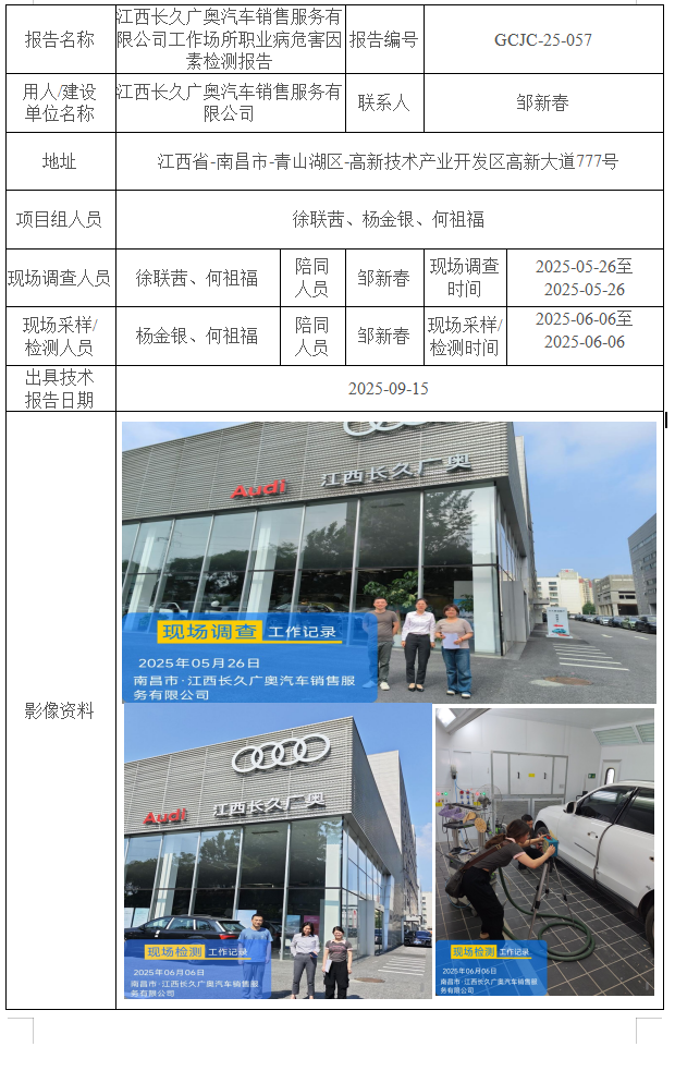 江西長久廣奧汽車銷售服務(wù)有限公司工作場所職業(yè)病危害因素檢測報告