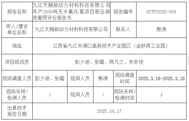九江天賜新動力材料科技有限公司年產(chǎn)3000噸無水氟化氫項目職業(yè)病危害預(yù)評價報告書