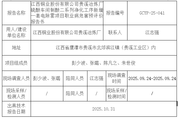 江西銅業(yè)股份有限公司貴溪冶煉廠硫酸車間制酸二系列凈化工序新增一套電除霧項目職業(yè)病危害預(yù)評價報告書