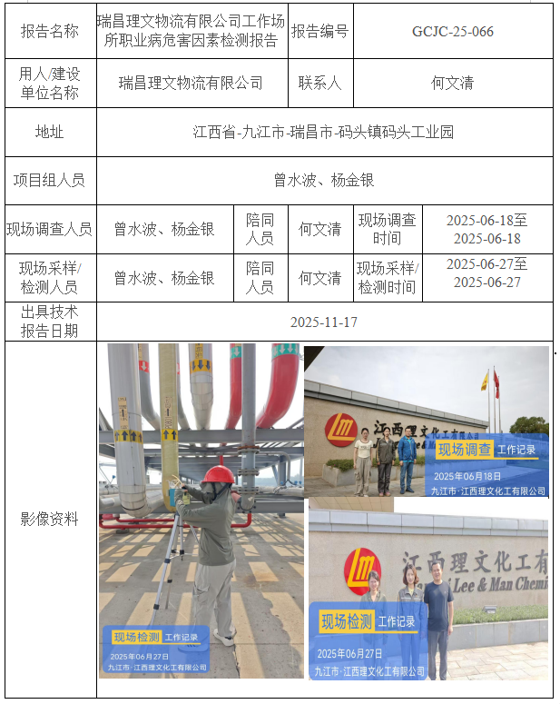 瑞昌理文物流有限公司工作場所職業(yè)病危害因素檢測報告