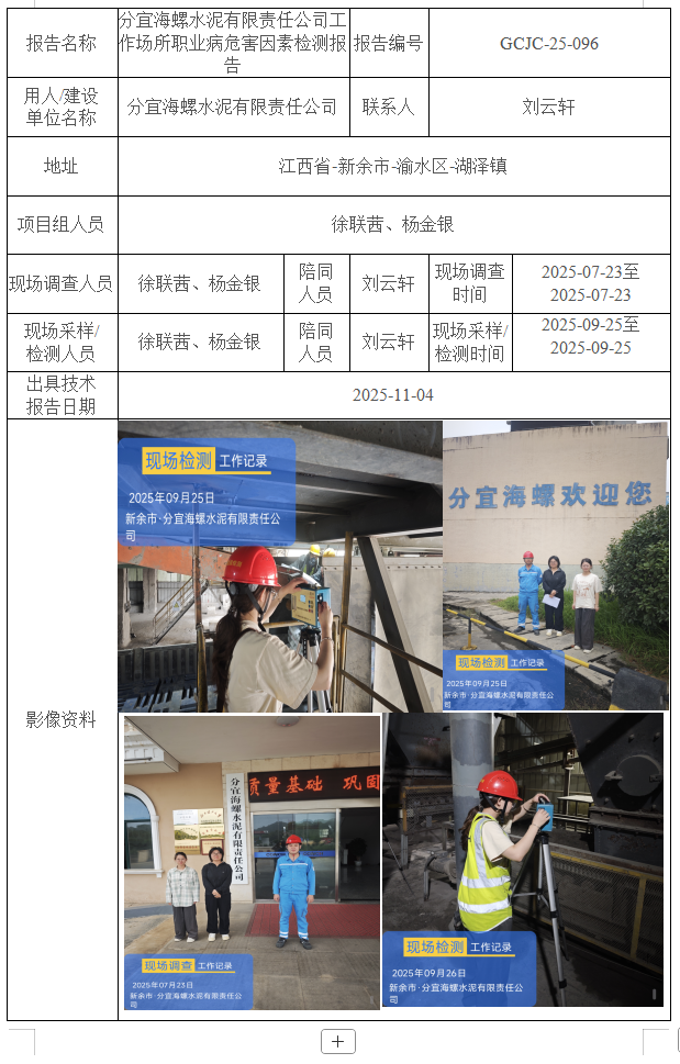 分宜海螺水泥有限責(zé)任公司工作場所職業(yè)病危害因素檢測報(bào)告