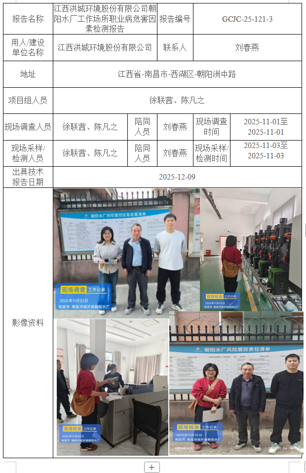 江西洪城環(huán)境股份有限公司朝陽水廠工作場所職業(yè)病危害因素檢測報告