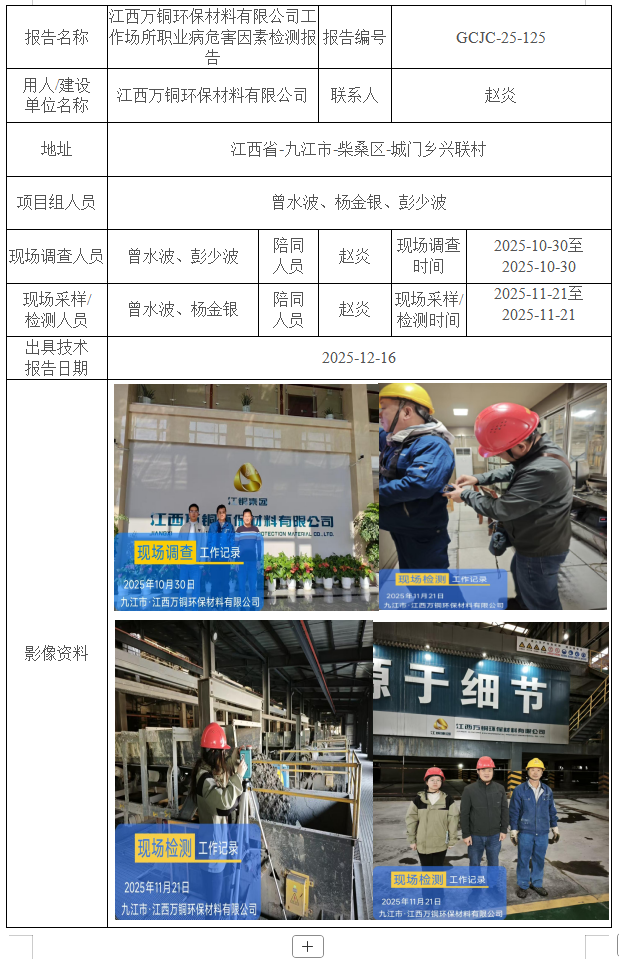 江西萬銅環(huán)保材料有限公司工作場所職業(yè)病危害因素檢測報告
