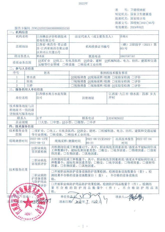 江西修水南方水泥有限公司工作場(chǎng)所職業(yè)病危害因素檢測(cè)報(bào)告