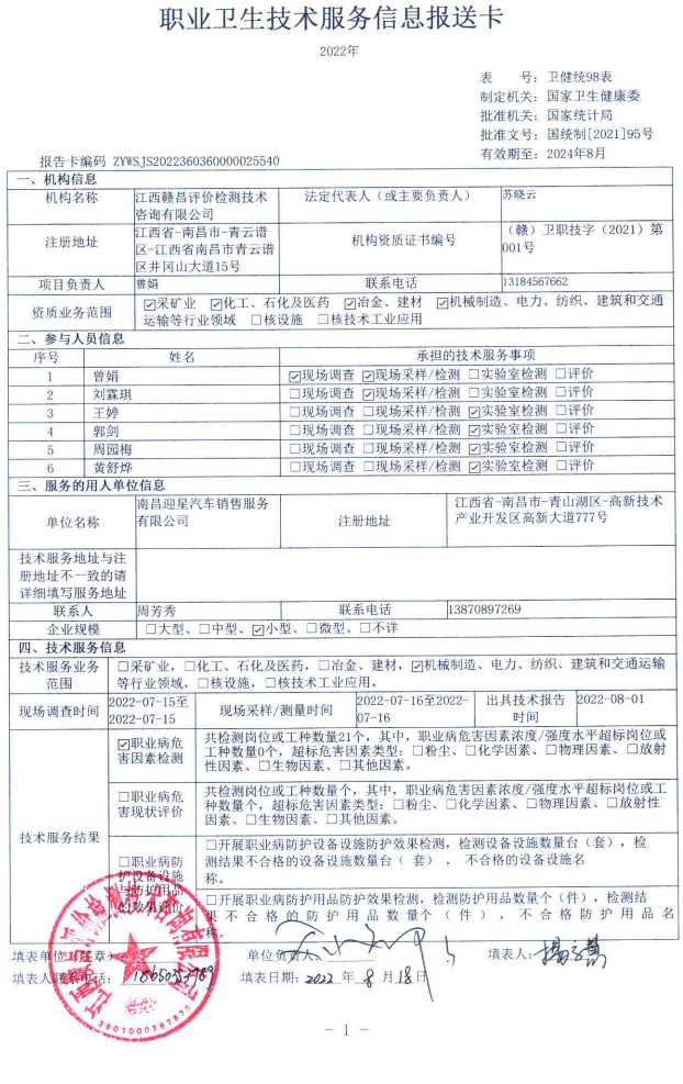 南昌迎星汽車銷售服務(wù)有限公司工作場所職業(yè)病危害因素檢測報告