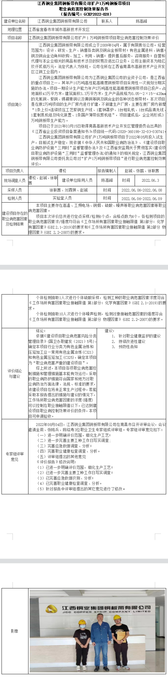 江西銅業(yè)集團(tuán)銅板帶有限公司擴(kuò)產(chǎn)1萬(wàn)噸銅板帶項(xiàng)目 職業(yè)病危害控制效果報(bào)告書(shū)