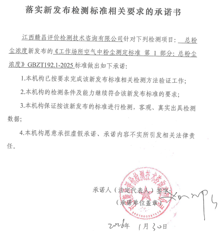 關(guān)于落實新發(fā)布檢測標(biāo)準(zhǔn)(總粉塵濃度)相關(guān)要求承諾書
