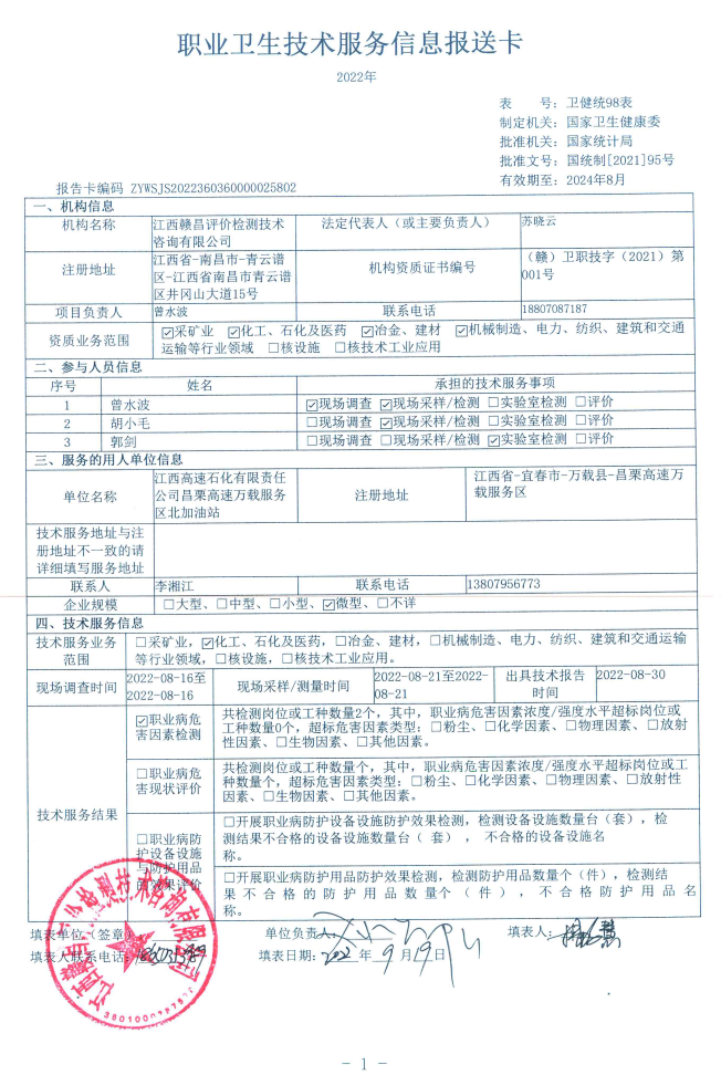 江西高速石化有限責任公司昌栗高速萬載服務區(qū)南加油站工作場所職業(yè)病危害因素檢測報告