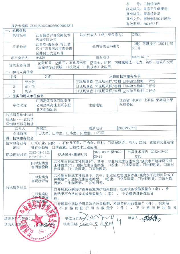 下一篇:江西高速石化有限責(zé)任公司昌寧高速寧都西服務(wù)區(qū)西加油站工作場(chǎng)所職業(yè)病危害因素檢測(cè)報(bào)告