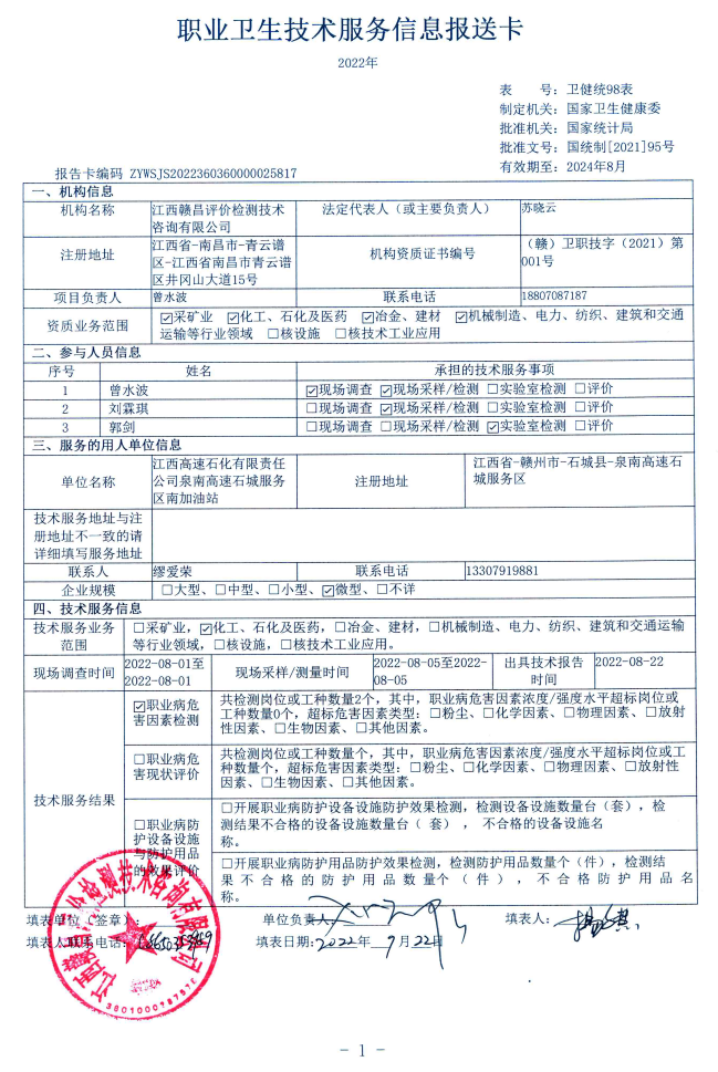 下一篇:江西高速石化有限責(zé)任公司濟(jì)廣高速寧都東服務(wù)區(qū)西加油站工作場(chǎng)所職業(yè)病危害因素檢測(cè)報(bào)告