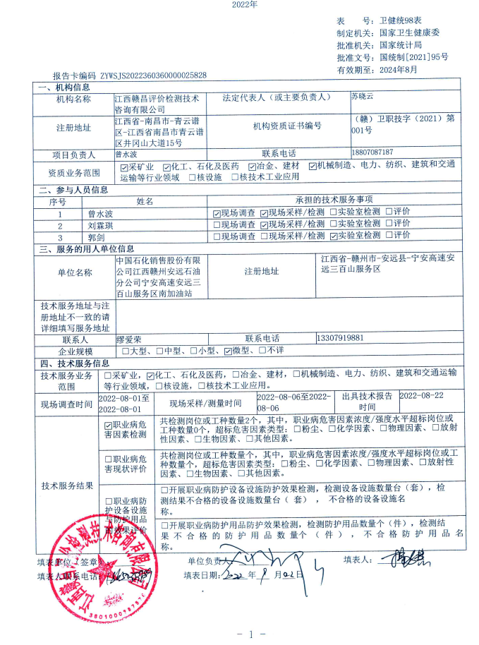 上一篇:中國石化銷售股份有限公司江西贛州安遠(yuǎn)石油分公司寧安高速安遠(yuǎn)三百山服務(wù)區(qū)北加油站工作場所職業(yè)病危害因素檢測報(bào)告