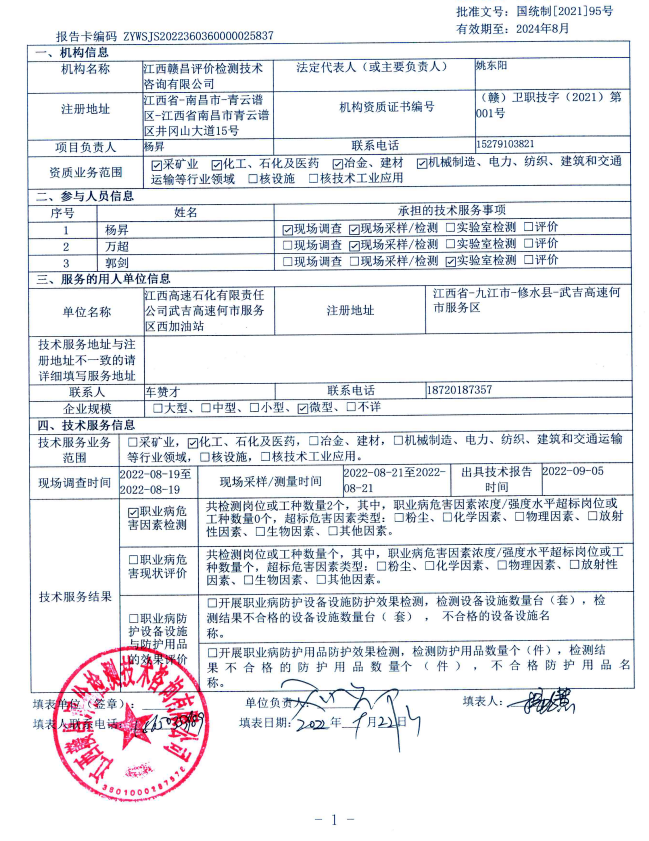 下一篇:江西高速石化有限責(zé)任公司昌栗高速上高東服務(wù)區(qū)北加油站工作場(chǎng)所職業(yè)病危害因素檢測(cè)報(bào)告