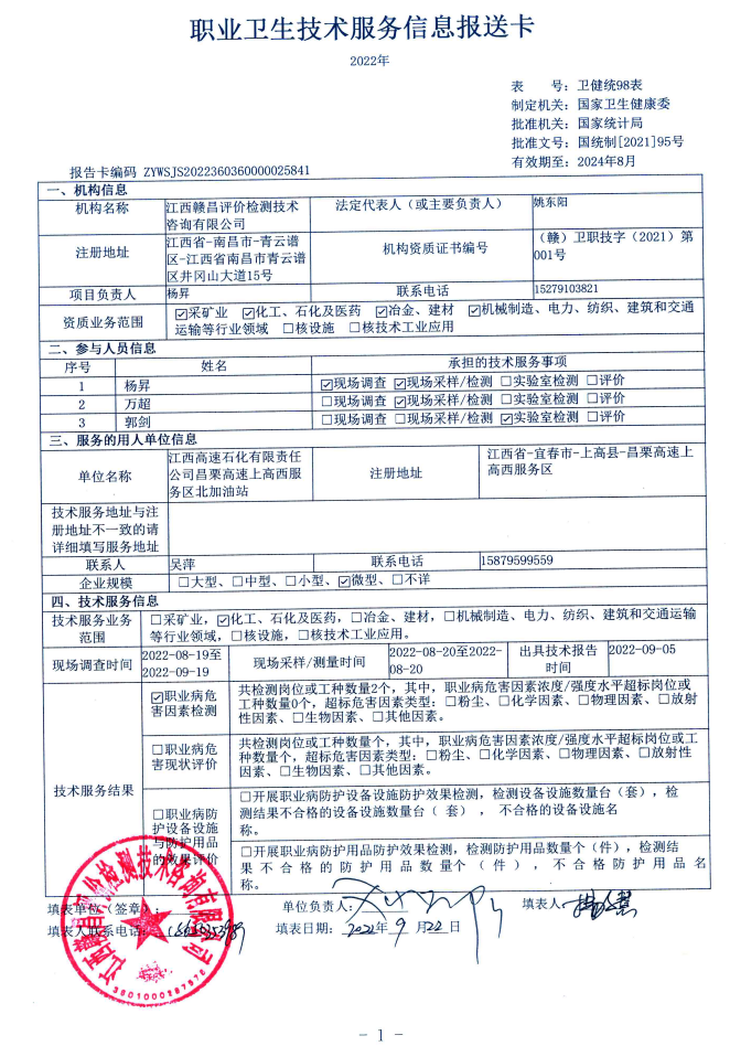 下一篇:江西高速石化有限責(zé)任公司武吉高速上高服務(wù)區(qū)西加油站工作場(chǎng)所職業(yè)病危害因素檢測(cè)報(bào)告
