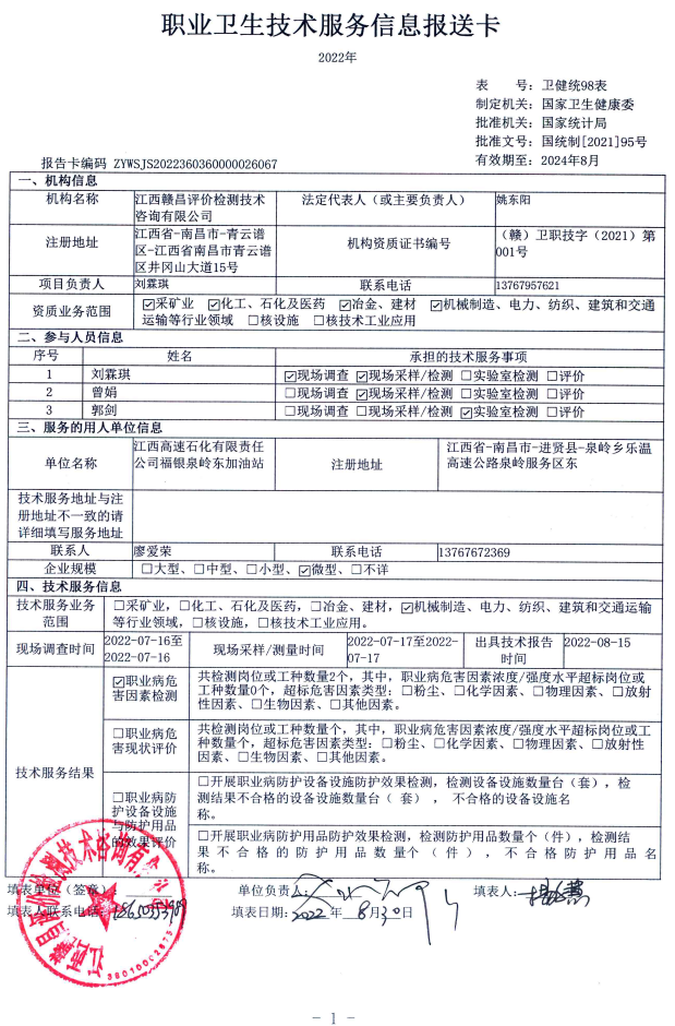 下一篇:江西高速石化有限責(zé)任公司福銀泉嶺西加油站工作場(chǎng)所職業(yè)病危害因素檢測(cè)報(bào)告