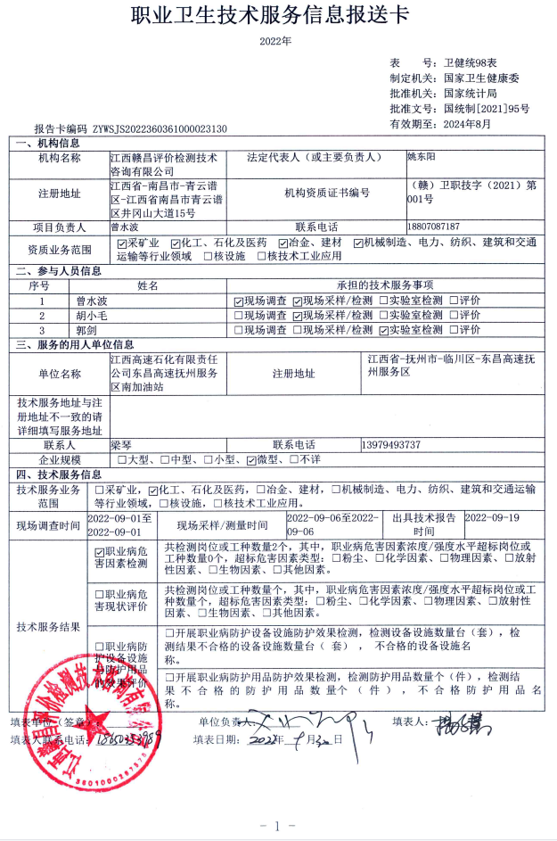 上一篇:江西高速石化有限責(zé)任公司東昌高速撫州服務(wù)區(qū)北加油站工作場所職業(yè)病危害因素檢測報(bào)告