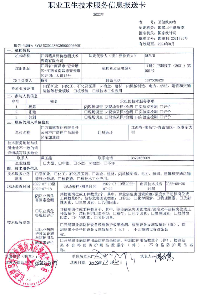 下一篇:江西高速石化有限責(zé)任公司濟(jì)廣高速?gòu)V昌服務(wù)區(qū)西加油站工作場(chǎng)所職業(yè)病危害因素檢測(cè)報(bào)告