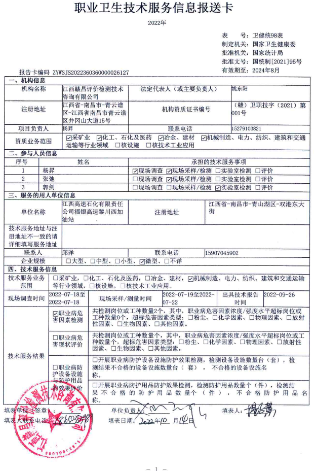 江西高速石化有限責任公司福銀高速黎川西加油站工作場所職業(yè)病危害因素檢測報告