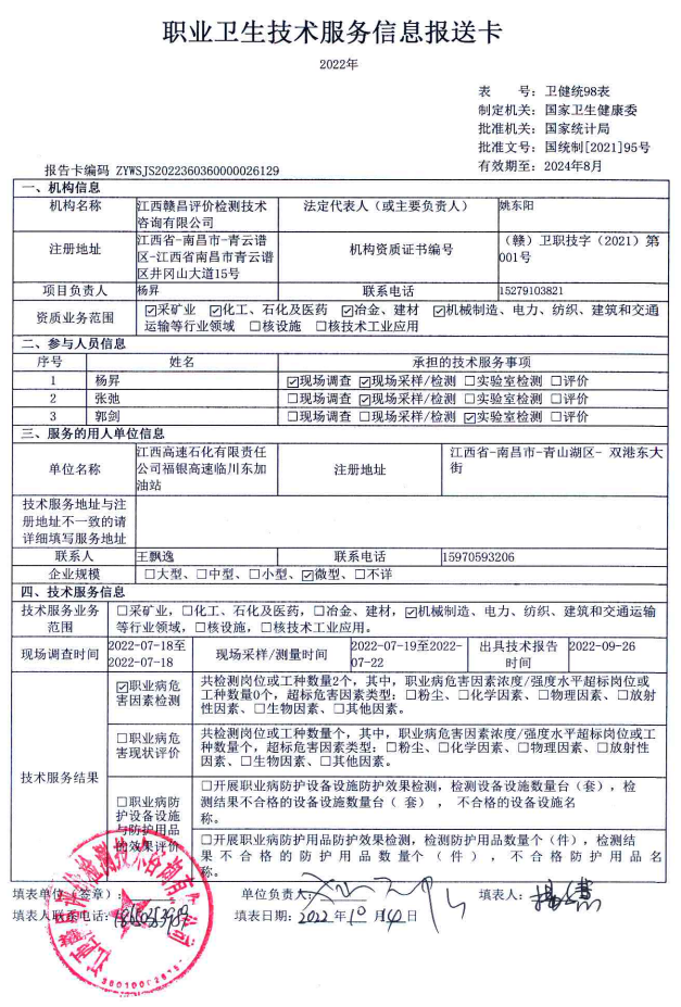 江西高速石化有限責任公司京福高速南城服務區(qū)東加油站工作場所職業(yè)病危害因素檢測報告