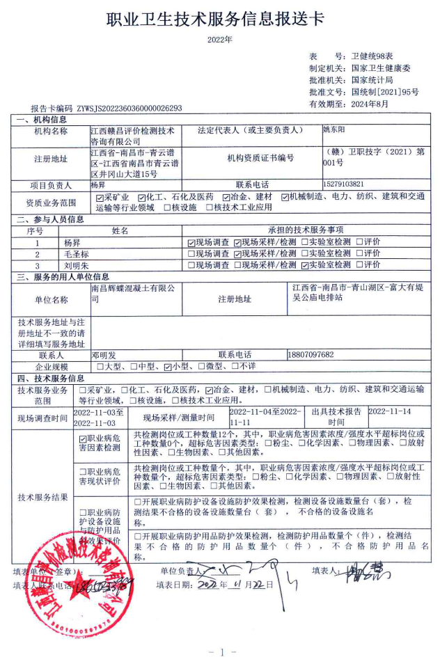南昌輝蝶混凝土有限公司工作場所職業(yè)病危害因素檢測報告