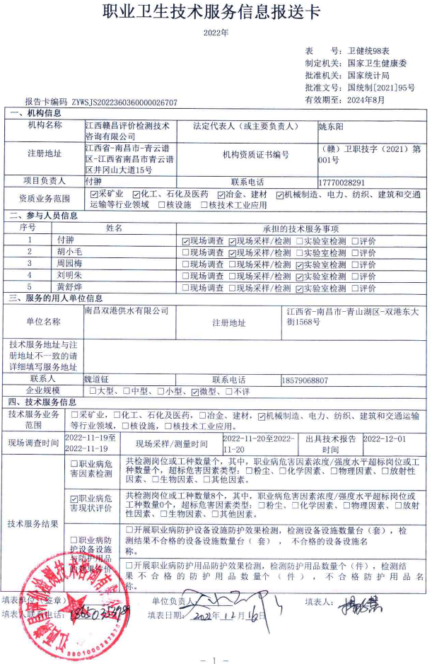 南昌雙港供水有限公司工作場所職業(yè)病危害因素檢測報告