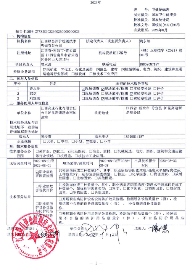 江西高速石化有限責任公司滬昆高速新余北加油站工作場所職業(yè)病危害因素檢測報告