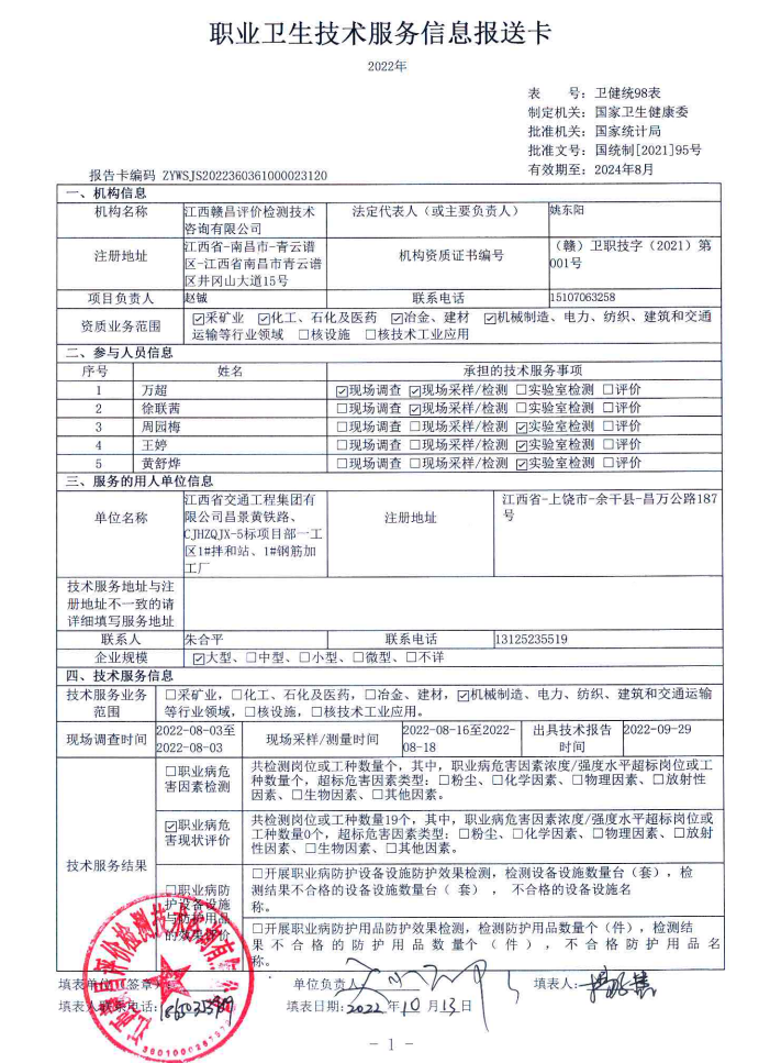 下一篇:中鐵二十五局集團有限公司昌景黃鐵路五標項目部3#拌和站、3#鋼筋加工廠、進賢制梁場拌和站、進賢制梁場鋼筋加工廠、4#鋼筋加工廠工作場所職業(yè)病危害因素檢測報告