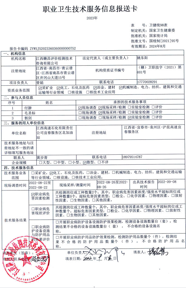 下一篇:江西高速石化有限責(zé)任公司滬昆高速宜春服務(wù)區(qū)南加油站工作場所職業(yè)病危害因素檢測報告