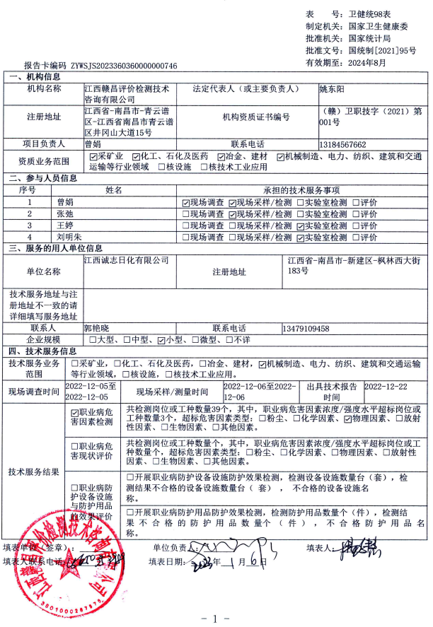 江西誠志日化有限公司工作場所職業(yè)病危害因素檢測報告