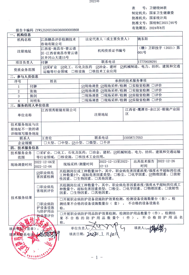 江西領(lǐng)秀眼鏡有限公司工作場所職業(yè)病危害因素檢測報告