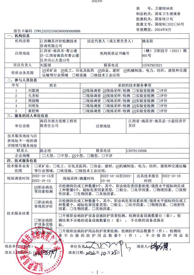 南昌市南方連鑄工程有限責任公司工作場所職業(yè)病危害因素檢測報告