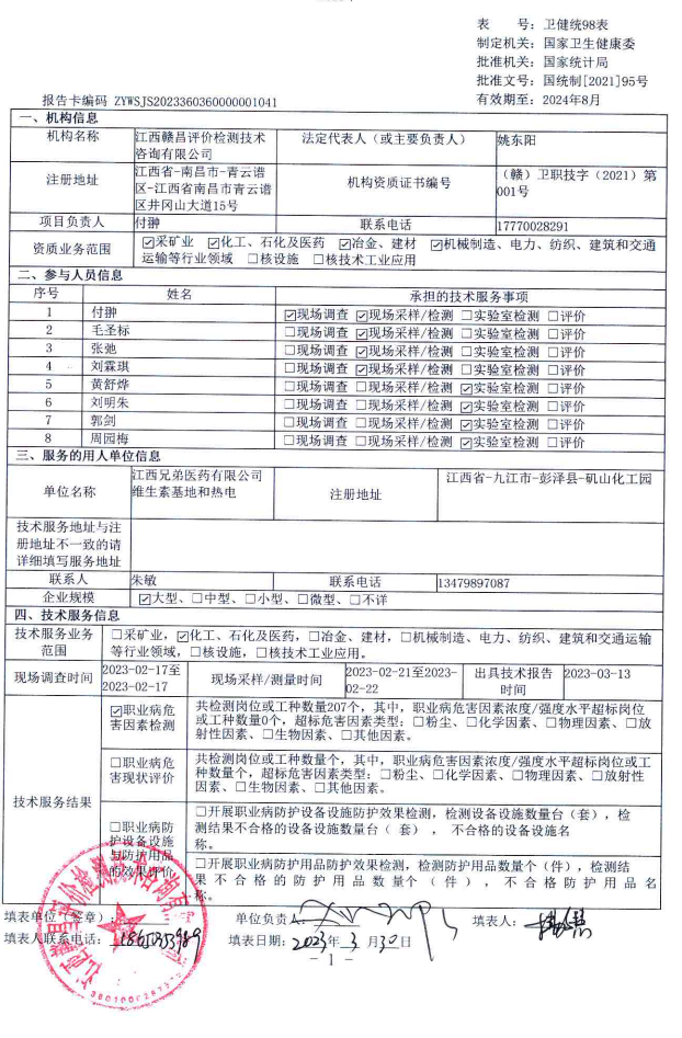江西兄弟醫(yī)藥有限公司維生素基地和熱電項(xiàng)目工作場所職業(yè)病危害因素檢測報(bào)告