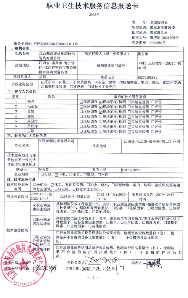 江西善淵藥業(yè)有限公司工作場所職業(yè)病危害因素檢測報告