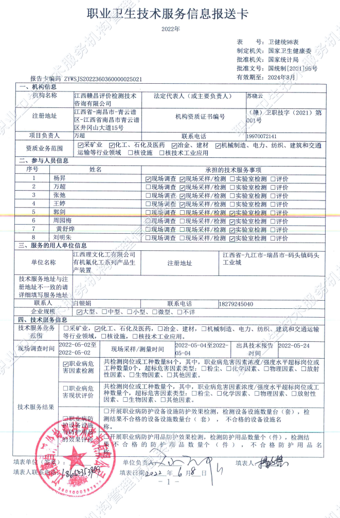 下一篇:江西理文化工有限公司2.5萬(wàn)噸/年無(wú)水氟化氫工作場(chǎng)所職業(yè)病危害因素檢測(cè)報(bào)告