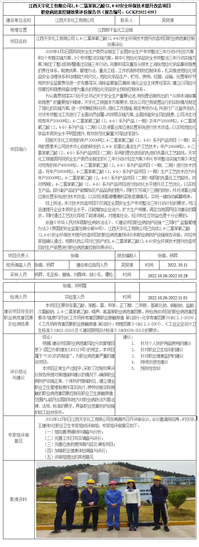 下一篇:江西天宇化工有限公司江西天宇化工有限公司10000t/a2,4-D 異辛酯生產(chǎn)裝置、20000t/a 2,4-D 二甲胺鹽水劑生產(chǎn)裝置項(xiàng)目(一期)職業(yè)病危害控制效果評(píng)價(jià)報(bào)告書(shū) (報(bào)告編號(hào):GCKP2022-040)