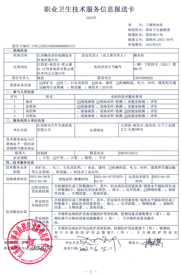 江西新電汽車空調(diào)系統(tǒng)有限公司工作場所職業(yè)病危害因素檢測報告
