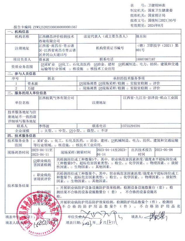 江西杭氧氣體有限公司工作場所職業(yè)病危害因素檢測報告